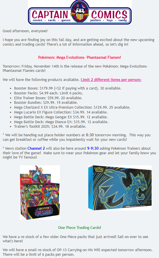 Comments Off on Newsletter: 11/13/25: Pokémon: Mega Evolutions-Phantasmal Flames, Batman/Deadpool, Spawn: Dark Ages