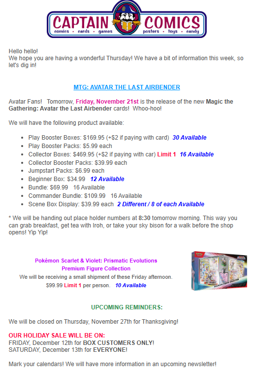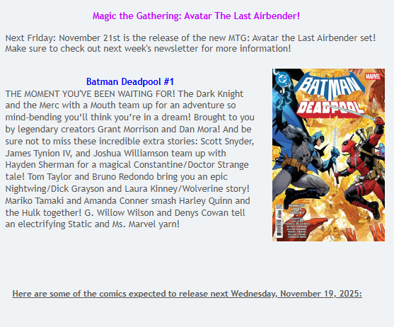 Comments Off on Newsletter: 11/20/25 Magic the Gathering: Avatar the Last Airbender, BRZRKR, Daredevil/Punisher