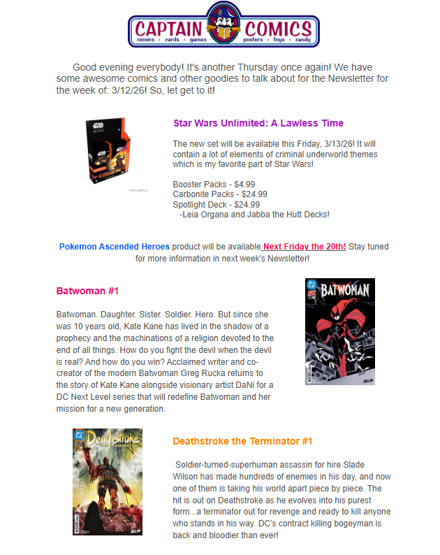 on Lobo #1, Batwoman #1, Deathstroke #1, and New Star Wars Unlimited!